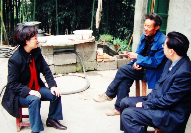 王瑛(左)生前下乡与群众交谈,共商致富之策。(资料照片)