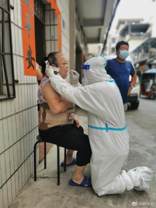 在广东多地启动的大规模核酸检测中,身着防护服的医务人员们不畏高温炎热,被人们亲切地称为“大白”。6月9日,东莞市虎门镇口腔科医生陈达峰在东方社区为行动不便的老人进行流动检测,为了让老人家舒服一点,他多次跪下来采集。6月7日,深圳市产科护士杨海萍为一名母亲怀抱中的孩子做核酸,她的姿势也是跪了下来。5月27日,广州市番禺区石楼镇社区卫生服务中心黎国伟在幼儿园采集咽拭子时,同样选择了跪下来以减少孩子们的呕吐反应。跪下来,降低了高度,增加了温度。“大白”们,谢谢你们,让老人孩子们被温柔以待。(记者 田建川)