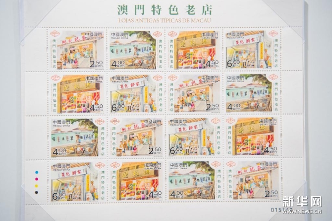 6月9日拍摄的“澳门特色老店”邮品。当日,澳门邮电局举行新闻发布会,宣布将于6月11日发行以“澳门特色老店”为题的新邮品。新华社记者张金加摄