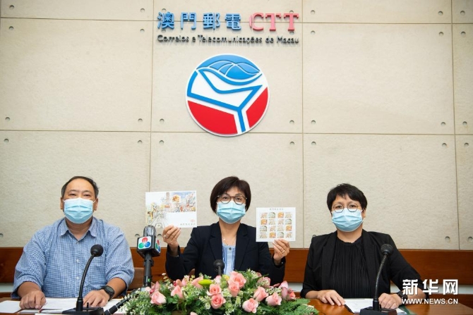 6月9日,澳门邮电局局长刘惠明(中)展示“澳门特色老店”邮品。新华社记者张金加摄