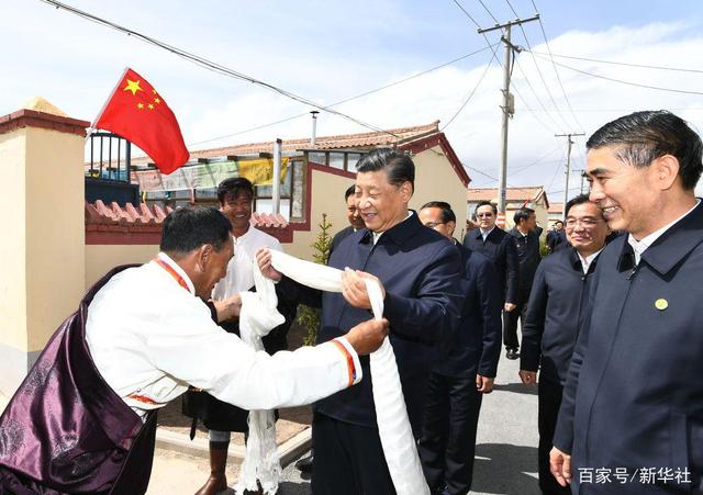 “欢迎总书记!”50岁的村民索南才让带着一家三代站在家门口,向总书记献上洁白的哈达。