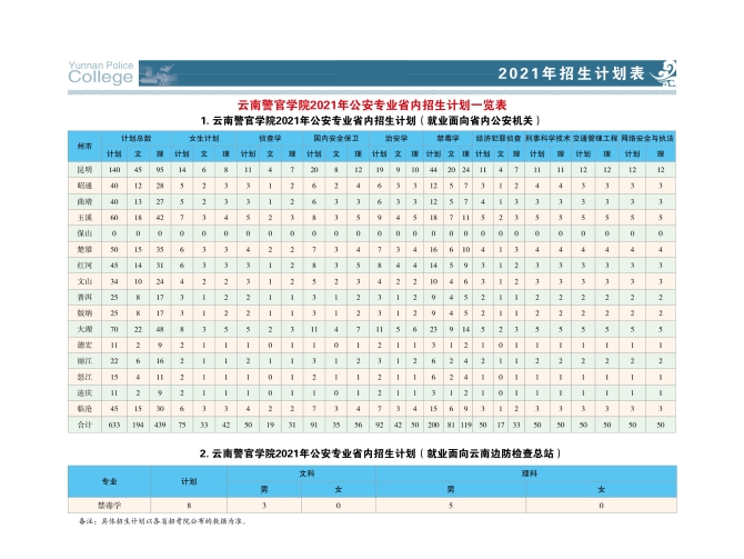 昆明信息港讯 记者合宇聪 6月16日,云南警官学院发布2021年本科招生计划,面向全国共招录1147人。其中:提前批次公安专业招生总数733人(就业面向地方公安机关省内各州市招生633人、就业面向云南边防检查总站省内招生8人、禁毒学公安专业省外招生92人);本科二批次非公安专业面向全国招生414人。