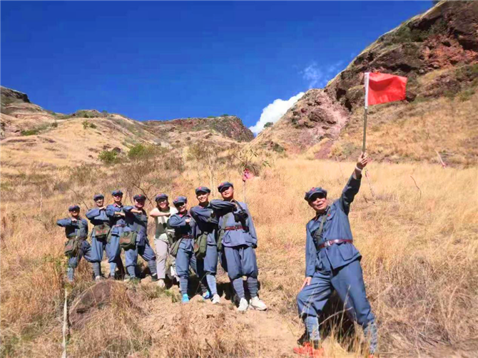 在金沙江河谷的山路上,学员们穿上先辈的战袍,踏上“长征”旅程。天空中骄阳似火,学员们心中的激情却比太阳更加火热,他们欢呼,雀跃,在这段光荣的道路上,他们证明了自己将会是红军精神最好的继承人。