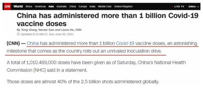 美国有线电视新闻网(CNN)6月20日的报道说,中国的新冠疫苗接种“无与伦比”。接种超过10亿剂次,这是一个惊人的里程碑。