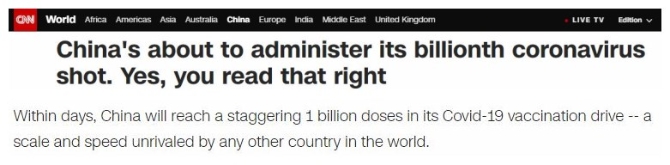 而在6月18日,CNN网站就发表过题为《中国即将进行第10亿次新冠疫苗接种。是的,你没听错》的报道,称中国“惊人的”接种规模和速度是世界上任何其他国家无法比拟的。