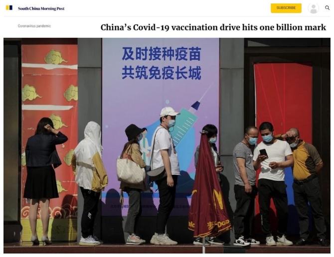 《南华早报》网站6月20日的报道说,中国在周末接种了第10亿剂次新冠疫苗,对全球规模最大的疫苗接种计划而言,这是一个重要的里程碑。