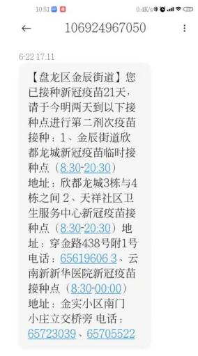 ——24小时不打烊、全天候等你。金辰街道新新华医院(北京路与北二环交叉口、金星立交桥、雄达茶城旁),从6月23日开始,24小时提供疫苗接种服务,联系电话:0871-65723039;0871-65705522。