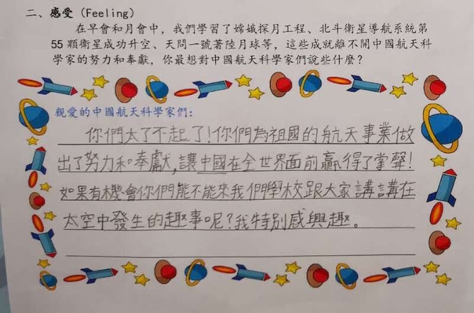 一名叫邱熙婷的五年级学生在给航天科学家的话中写道:“你们太了不起了!如果有机会,你们能不能来我们学校,跟大家讲讲太空中发生的趣事呢?”
