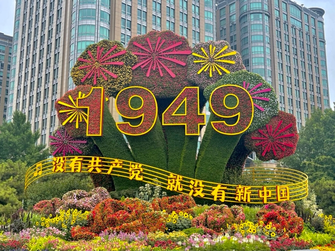 含义:花坛以“1949”、烟花为主景,配以《没有共产党就没有新中国》乐谱、簇拥的花朵等,体现在中国共产党的领导下,中国人民从此站起来的辉煌时刻。