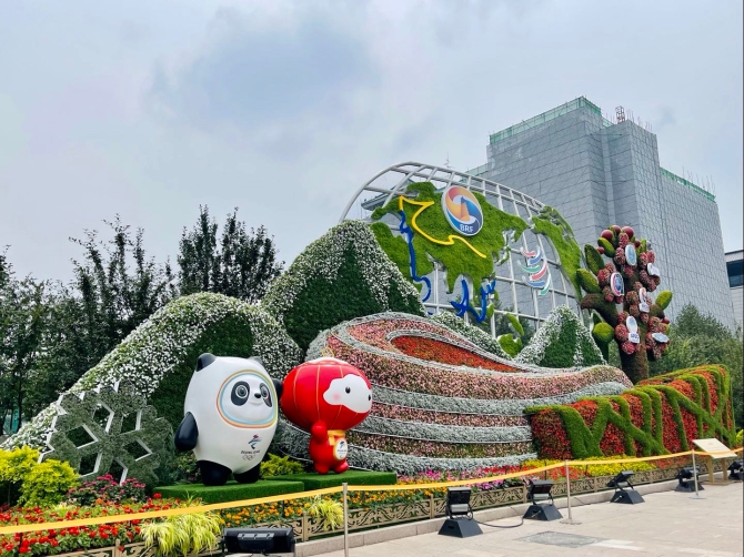 含义:花坛以鸟巢(2008年北京奥运会)、冰丝带(2022年北京冬奥会)、世界地图为主景,配以冬奥会吉祥物以及我国举办或参与的重大国际活动标识,体现在党的正确领导下,伟大的祖国阔步走向世界。