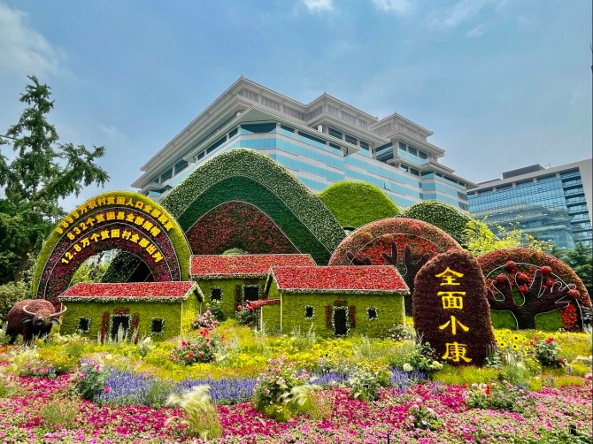 含义:花坛以十八洞村旧貌换新颜的幸福生活为场景,体现在迎来中国共产党成立一百周年的重要时刻,"全面建成小康社会取得伟大历史性成就,决战脱贫攻坚取得决定性胜利"。