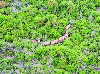 6月22日,无人机在峨山县大龙潭乡附近山林中拍摄的北移象群。