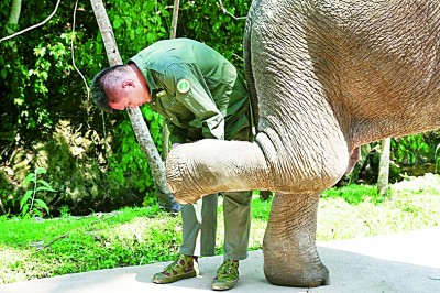 云南亚洲象种源繁育及救助中心的亚洲象护理人员被称作“象爸爸”,图为“象爸爸”给救助的亚洲象洗澡、清洁身体。