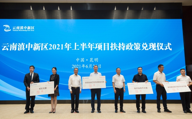 在重点项目扶持政策兑现仪式上,滇中新区向12个招商引资重点项目兑现约4亿元扶持奖励。这些项目是:北汽云南瑞丽汽车有限公司昆明分公司、云南创视界光电科技有限公司、昆明先导新材料科技有限责任公司、云南大益微生物技术有限公司、云南天江一方药业有限公司、中汽研汽车检验中心(昆明)有限公司、云南省能源投资集团有限公司、昆药集团股份有限公司、云南凝慧电子科技有限公司、云南栢田医疗科技有限公司、云南欧铂斯医疗科技有限公司、云南沪滇应急装备制造有限公司。