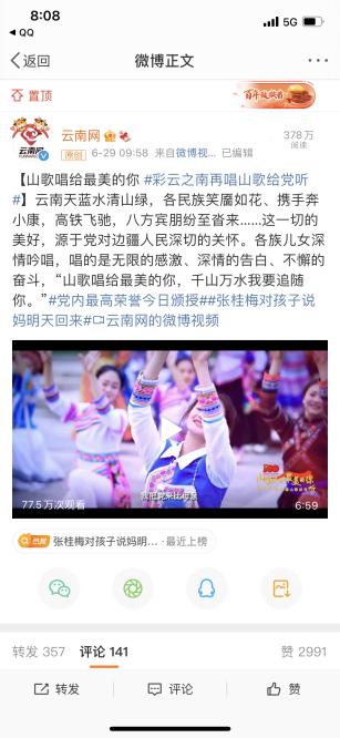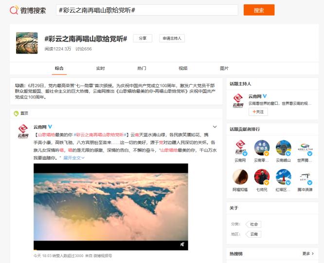 云南网讯(记者 唐莉娜 赵玮 陆筱婷)“唱出了云岭儿女对党的感恩,唱出了每个人心中的大美云南!”动人的歌词、优美的旋律,今天,山歌唱给最美的你·彩云之南再唱山歌给党听刷屏整个网络!6月29日,庆祝中国共产党成立100周年《山歌唱给最美的你·再唱山歌给党听》MV正式上线。截至当天20时,人民网、新华网、中国新闻网等央媒及其新媒体平台、云南主流媒体网站客户端转载超150条,微信59条,微博740余条,微博话题#彩云之南再唱山歌给党听#阅读1224.3万。初步统计,话题两次登上新浪微博热搜榜,全网累计浏览量超1700万次。