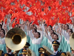 此时的南国深圳,盐田港码头,万吨巨轮整装待发;居民小区楼宇内的万家灯火,透出城市的温度。随着《唱支山歌给党听》的清澈旋律穿破夜空,城市光影秀掀开了序幕。三条耀眼的光柱,点亮城市的夜空。巨大的中国共产党党徽呈现在天穹之上,2021架无人机编队组成一面巨大的党旗,在城市的上空缓缓飘拂。作为中国特色社会主义先行示范区的深圳,这座以人民为中心的城市,今晚由人民来点亮!