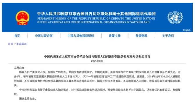 人们还记得,就在此前的联合国人权理事会第47届会议上,中国代表团与贩卖人口问题特别报告员进行互动对话时,曾对美国等国存在的严重现代奴役和贩卖人口现象表示了严重关切。