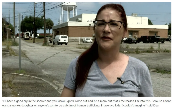 佐治亚州的莉亚·迪近两年来一直致力于提高人们对当地猖獗的人口贩卖活动的认识。“我会在洗澡的时候大哭一场,因为我不想让任何人的儿女成为人口贩卖的受害者。我有两个孩子,我无法想象会发生这种事!”