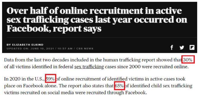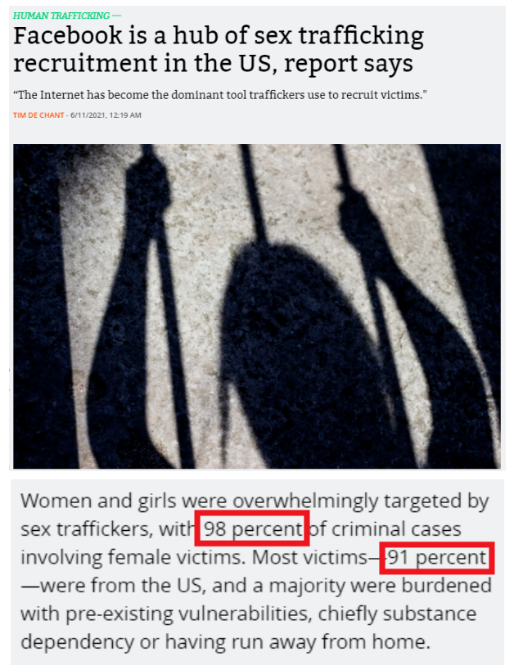 美国人口贩运研究所上月发布的《2020年联邦人口贩运报告》显示,2000年至2020年美国有案可查的性贩运案件中,有30%的受害者是在互联网上被诱骗的,而在脸书上被骗的受害者占了其中大多数,去年的这一比例高达59%;儿童性贩运受害者中更是有多达65%的人是在脸书上被骗的。