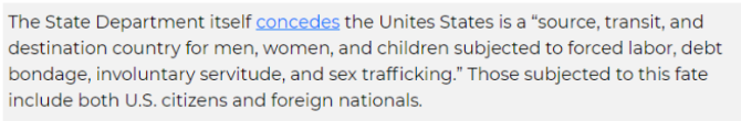 就连美国国务院自己也承认,美国是强迫劳动、债务奴役、非自愿奴役、性贩运受害者的“来源国、中转国和目的地国”,受害者中包括美国公民和外国公民。