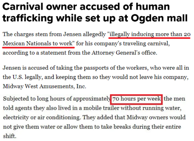上月底,墨西哥驻美国领事部门通知犹他州总检察长办公室:该州的奥格登市可能发生了一起贩卖劳工案。当地一家娱乐公司老板乔丹·纳撒尼尔·詹森涉嫌非法诱使20多名墨西哥公民为其公司工作。
