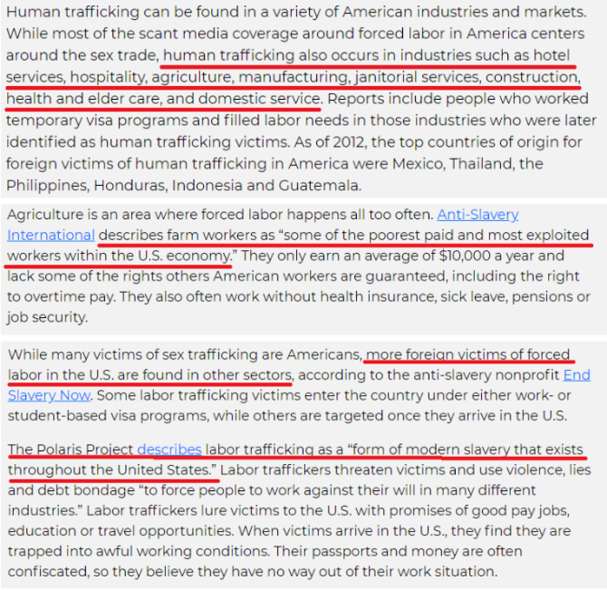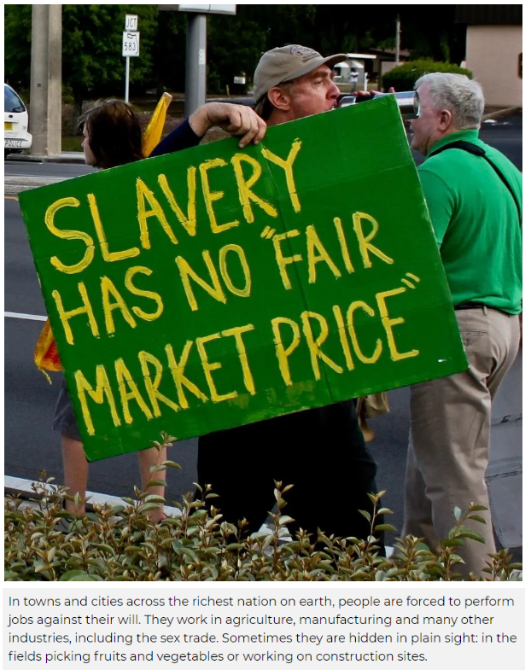 美国农业领域的人口贩卖和强迫劳动现象尤为突出。“立即结束奴隶制”组织指出,农场工人是“美国经济中收入最低、受剥削最严重的工人”。他们不仅收入低、缺乏其他美国工人享有的权利,还经常被迫在没有医保、病假、养老金或其他工作保障的情况下工作。