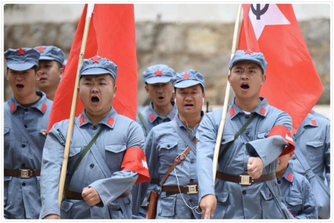 下午2点,首批参加体验教育活动的学员,身穿红军军装在清河村委会小广场集合。哨声吹响,他们听从号令,迅速整齐列队,在“红军政治教员”的带领下,党员重温入党誓词、中国工农红军誓词。炎炎烈日下,铮铮誓言在山村上空回荡,仿佛瞬间回到了那个艰苦奋斗的年代。