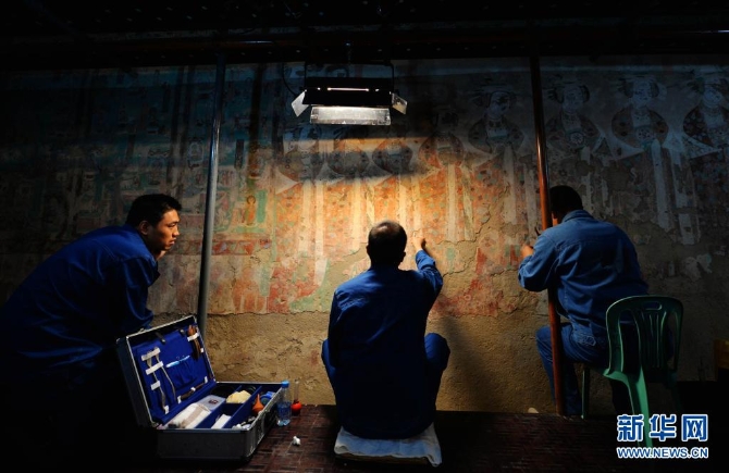 敦煌研究院技术人员在莫高窟98窟内对病害壁画进行修复(2014年9月3日摄)。新华社记者 陈斌 摄