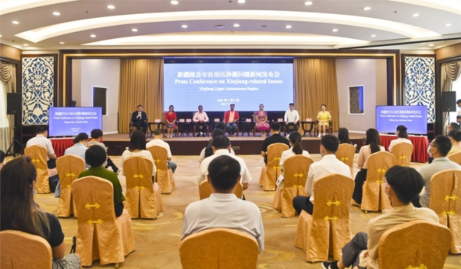 近期,美国等西方国家基于个别反华势力的谎言和虚假信息,妄自断言中国新疆存在“种族灭绝”,7月7日,新疆维吾尔自治区在乌鲁木齐召开专场涉疆问题新闻发布会,来自乌鲁木齐、喀什地区、和田地区、阿克苏地区等地的6位少数民族群众代表,用亲身经历和现实生活现场发声驳斥所谓“种族灭绝”的涉疆谎言。