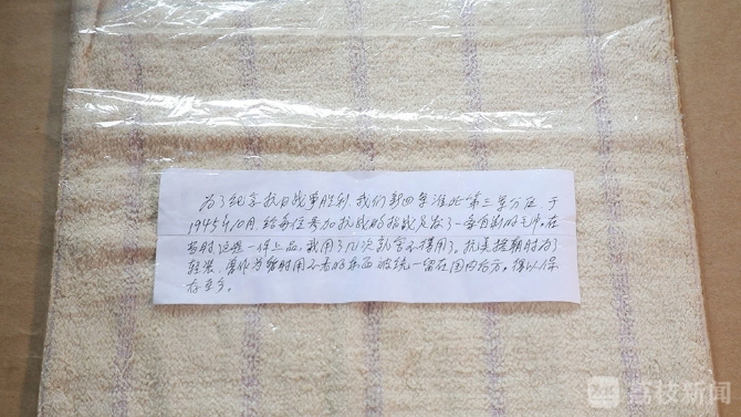 “这可是宝贝呀!”朱亚向蒋卓昀介绍道。这条毛巾,是为了庆祝抗日战争胜利,当时朱亚所在的新四军淮北第三军分区发给指战员们的纪念品。