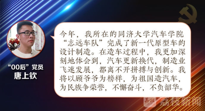 今年刚刚成为预备党员的唐上钦,来自同济大学汽车学院,是标准的“00后”,和顾海楼的生长环境截然不同,他生逢盛世,与新时代同向同行、共同前进。