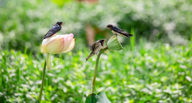 刚出窝的小燕子还不具备独立生存的本领,常常落在枝头及荷花上,等待大燕子捕食喂养。大燕子每天忙忙碌碌,为小燕子抓食,培养锻炼小燕子的生存本领。小燕子终会羽翼丰满,在天空中自由展翅翱翔!