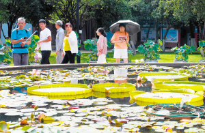 图为市民在大观公园欣赏王莲。记者杨艳辉/摄
