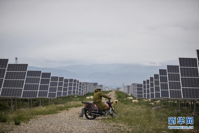 一名牧民在青海省海南藏族自治州共和县光伏产业园区内放牧(2019年6月16日摄)。新华社记者 吴刚 摄