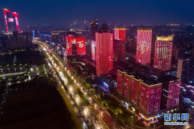 这是6月25日在南京市河西新城中轴线拍摄的庆祝建党百年主题灯光秀(无人机照片)。新华社记者 李博 摄