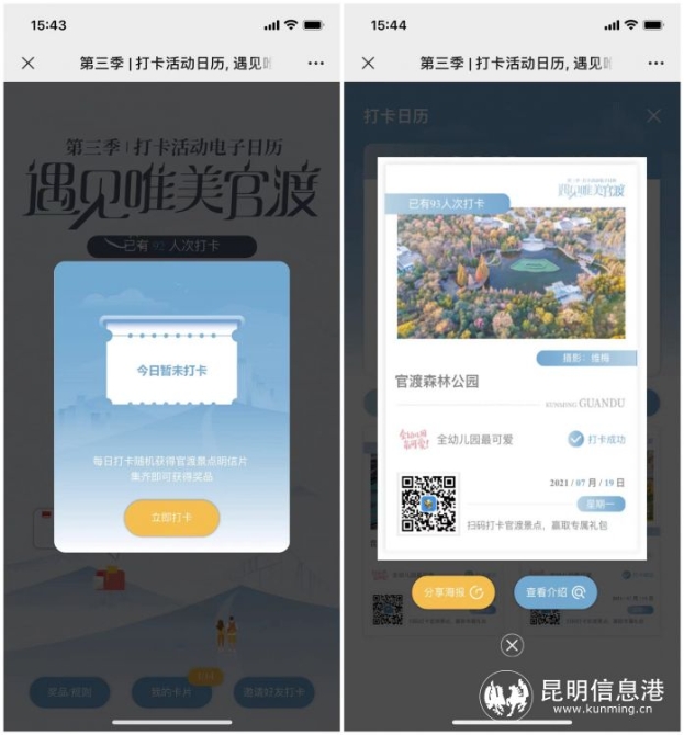 作为全新的线上互动模式,“遇见唯美官渡”电子打卡日历以每日打卡集电子卡牌的形式开展。官渡森林公园、王官湿地公园、凤凰山天文台......每张卡牌上不仅有展现官渡美景的照片,还可在相应页面内查看打卡地介绍,了解官渡的故事。而电子打卡日历这一形式也突破了常规,连续打卡14天收集14张电子卡牌,在传递官渡之美的同时,也将调动更多人持续参与。