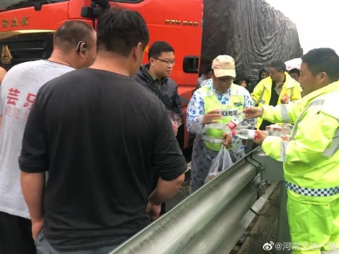 连霍高速巩义段620公里处因暴雨车辆滞留,河南巩义服务区人员火速驰援,为被困人员送去应急必需品。