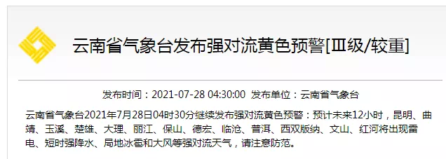 据云南气象预报,受切变线影响,预计7月27日夜间至29日滇西北、滇西、滇中西部、滇西南和滇东南将出现中到大雨局部暴雨、大暴雨,并伴有雷暴、短时强降水、局地冰雹和大风等强对流天气,过程累积雨量20~40毫米,局地60~120毫米。