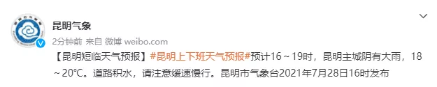 昆明市气象台今天中午发布强对流黄色预警:预计未来12小时,昆明主城、石林、宜良、呈贡、晋宁、安宁、嵩明、富民、禄劝、寻甸、东川将出现强对流天气,可能伴有雷电、短时强降雨、局地冰雹和大风。请市民们及时关注天气预报,做好防范措施。