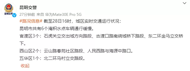 五华区4个:北二环马村立交路段、西昌路云大医院路段、西昌路(大观路口至瓦仓西路)、学府路与教场中路口。