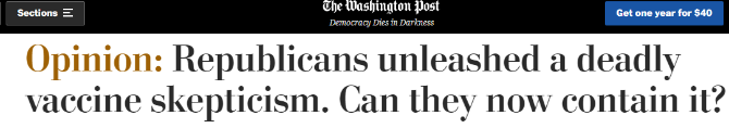 7月25日,《华盛顿邮报》刊登专栏作家、美国乔治敦大学教授小尤金·约瑟夫·迪昂撰写的题为《共和党人制造了致命的疫苗怀疑论,现在他们还能遏制怀疑论吗?》的文章。