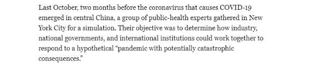 这场演习与如今的新冠肺炎疫情演进过程高度吻合,不得不让人发出疑问:演习好像是一出新冠大流行的剧本啊!