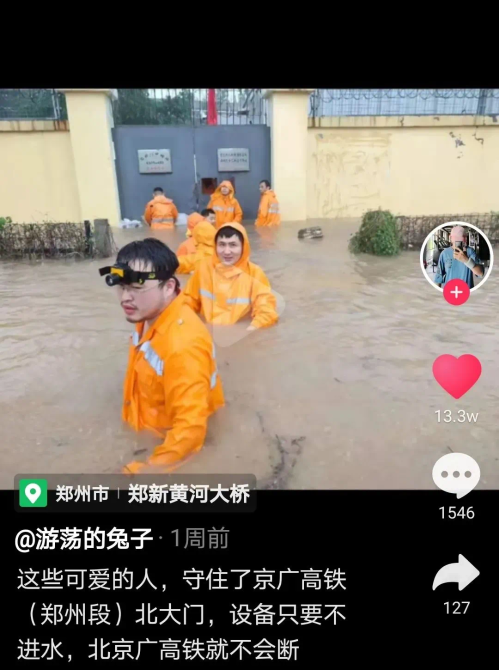 京广高铁21中继站位于河南省郑州市的北四环,因处于高架桥下,周边地势极低,受持续强降雨影响,很快被洪水围困,成了危及高铁安全的“孤岛”。