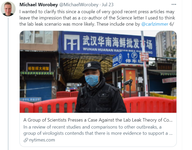 此外,参与公开信联署的亚利桑那大学进化生物学家迈克尔·沃罗比日前也在社交媒体上澄清,他在公开信上签名,让人误以为他认为“实验室泄漏”假说更有可能,但实际上他认为动物起源更有可能。