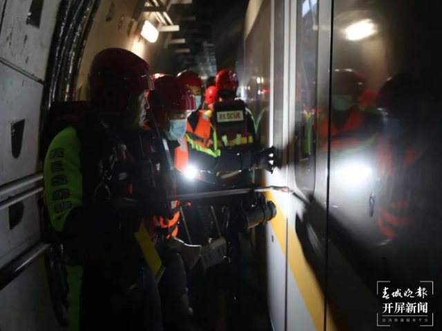 救援力量借助导向绳搜索抵达轨道区间段内被困地铁车辆位置,派人对车顶空调进行拆除提升,开辟通道进入车厢内部,利用车厢内车门紧急开关,解除车门锁闭状态;外部救援人员利用破拆工具同步拆除车厢玻璃,并在内部救援人员配合下对车门进行完全扩张,开辟逃生通道,及时引导输转100余名被困人员和2名受伤人员至安全地带,交由医疗人员检查救治。