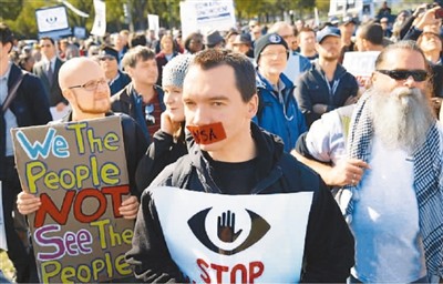 二〇一三年美国就曾被曝光监听欧盟政要。图为二〇一三年十月二十六日,美国华盛顿,上千美国民众走向美国国会,对美国国家安全局的监控行为表示抗议。