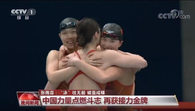 中国游泳队队员 张雨霏:前150(米)我都是说算了算了,我觉得人家肯定比我快,因为我不是200(米)自(由泳)主项。就游到最后50(米),我也不知道哪(来的力量),就是那种中国力量,你知道吗,从心底里燃起来,就不服输,我一定要跟你拼了。