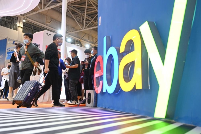 2021年3月18日,首届中国跨境电商交易会在福建举行,参观者从ebay展位前走过。新华社记者 林善传 摄