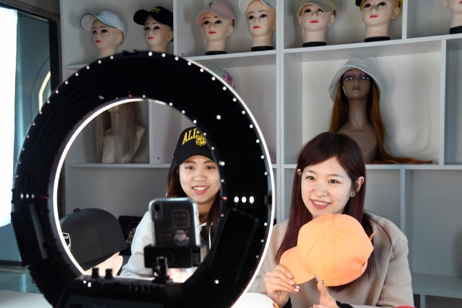 2021年3月4日,在青岛上合跨境电商产业园,主播在直播销售帽子。新华社记者 李紫恒 摄