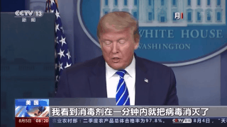 时任美国总统 特朗普:我看到消毒剂在一分钟内就把病毒消灭了,有没有一种方法能达到这种效果呢,比如通过体内注射,或者类似清洗的方式。
